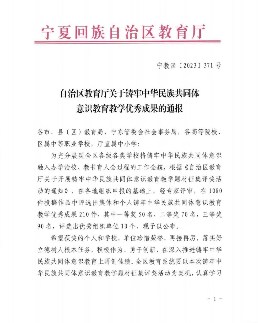 近日,自治区教育厅发布了《关于铸牢中华民族共同体意识教育教学优秀成果的通报》(宁教函〔2023〕371号),对全区各级各类学校铸牢中华民族共同体意识教育教学题材征集评奖活动结果公布,由吃瓜大赛