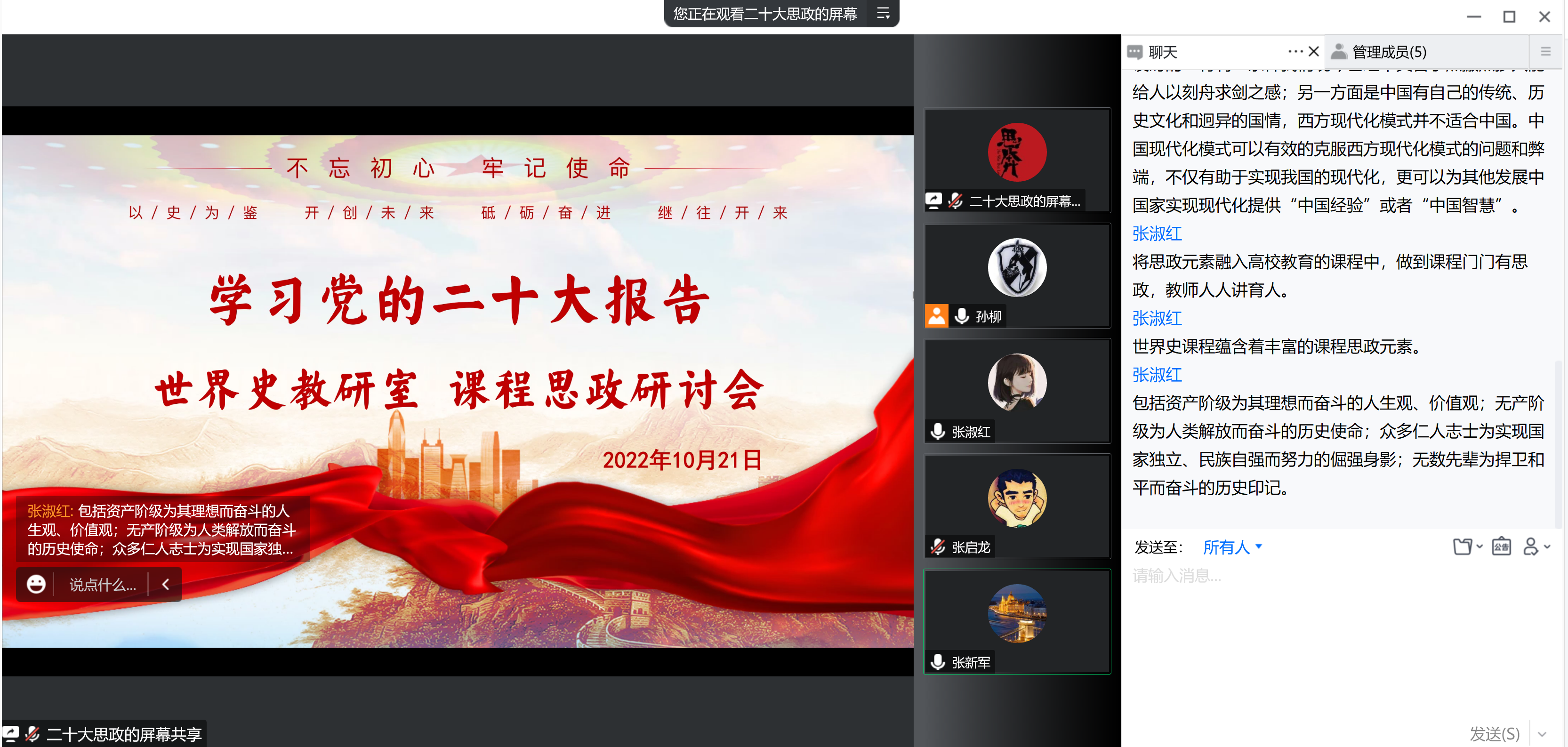 历史系世界史教研室于10月21日上午进行“党的二十大报告与世界史课程思政”专题研讨会,教研室教师就党的二十大报告内容、精髓与世界史课程思政之间的关系在腾讯会议进行了深入探讨。