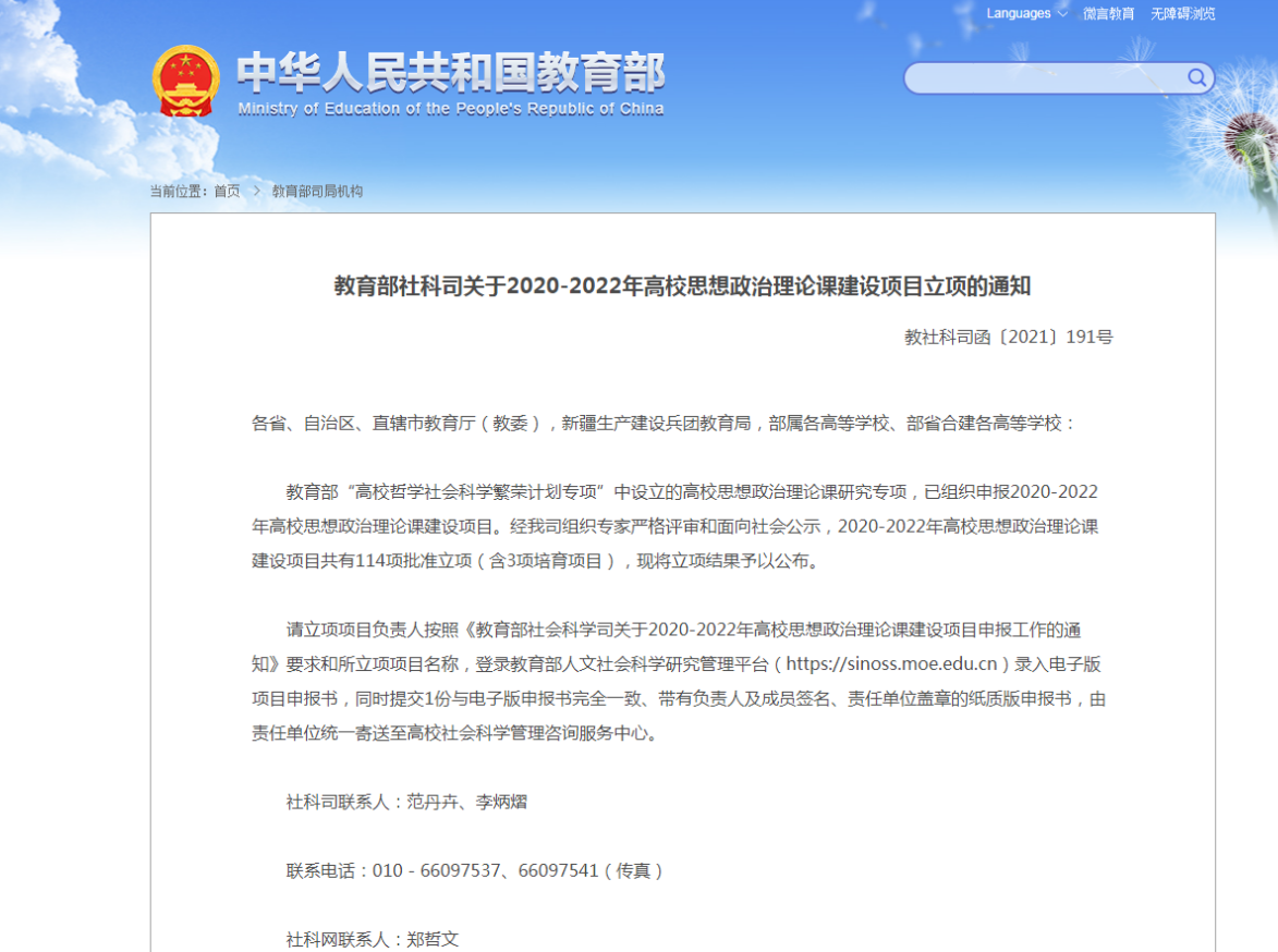 据悉,高校思想政治理论课建设项目是教育部“高校哲学社会科学繁荣计划专项”中设立的研究专项。项目的设立是学习贯彻习近平总书记在学校思政课教师座谈会上的重要讲话精神的重要举措,也是深化新时代高校思想政治理论课改革创新的具体实践。项目下设四个板块:高校思想政治理论课“手拉手”集体备课中心、高校思想政治理论课名师工作室、高校思想政治理论课虚拟仿真体验教学中心、高校思想政治理论课教学创新中心。自2020年11月启动,经各高校申报,教育部组织专家严格评审和社会公示,2020-2022年高校思想政治理论课建设项目共有114项批准立项(含3项培育项目),其中全国高校思政课名师工作室共69家。