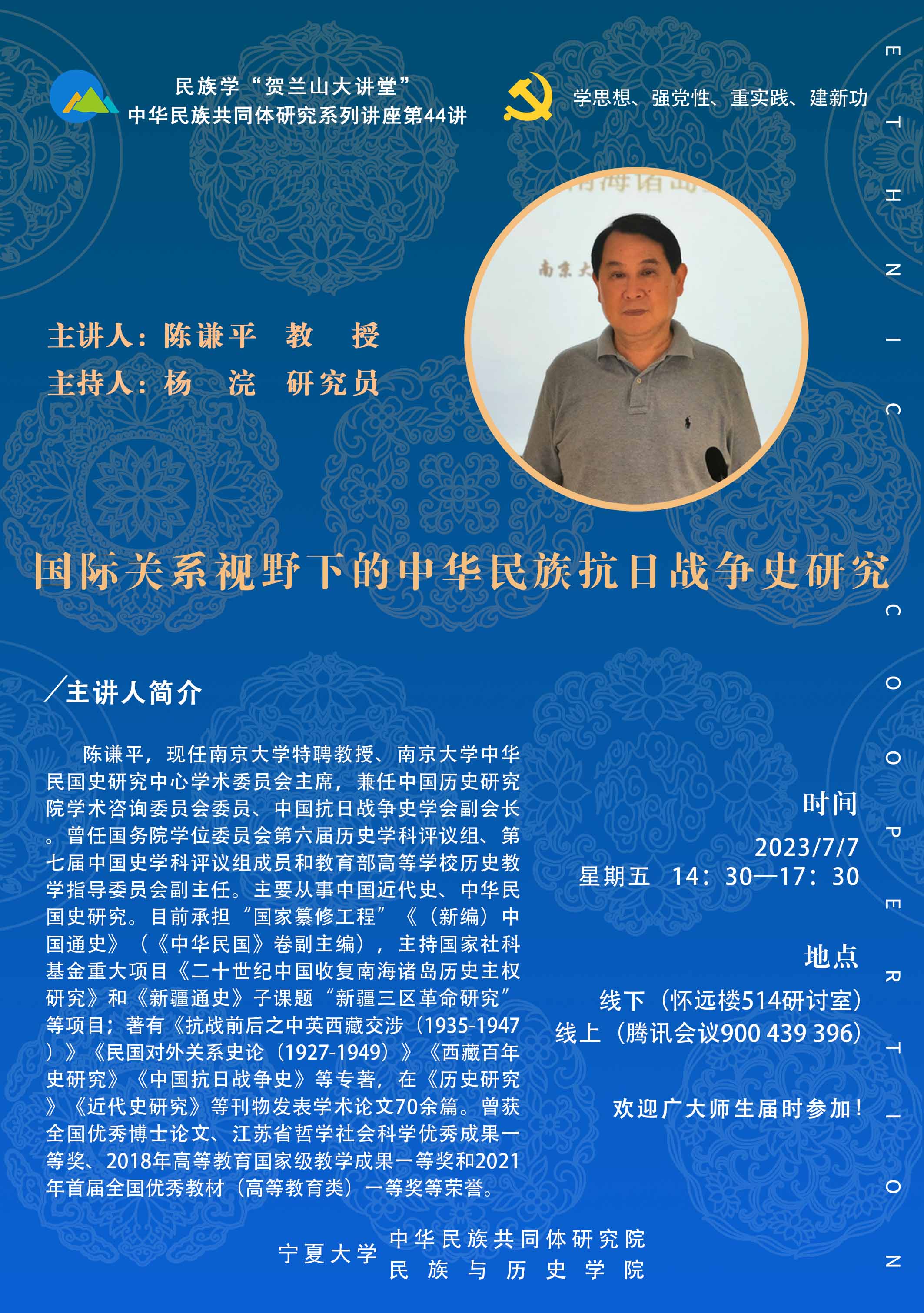 陈谦平,现任南京大学特聘教授、南京大学中华民国史研究中心学术委员会主席,兼任中国历史研究院学术咨询委员会委员、中国抗日战争史学会副会长。曾任国务院学位委员会第六届历史学科评议组、第七届中国史学科评议组成员和教育部高等学校历史教学指导委员会副主任。主要从事中国近代史、中华民国史研究。目前承担“国家纂修工程”《(新编)中国通史》(《中华民国》卷副主编),主持国家社科基金重大项目《二十世纪中国收复南海诸岛历史主权研究》和《新疆通史》子课题“新疆三区革命研究”等项目;著有《抗战前后之中英西藏交涉(1935-1947)》《民国对外关系史论(1927-1949)》《西藏百年史研究》《中国抗日战争史》等专著,在《历史研究》《近代史研究》等刊物发表学术论文70余篇。曾获全国优秀博士论文、江苏省哲学社会科学优秀成果一等奖、2018年高等教育国家级教学成果一等奖和2021年首届全国优秀教材(高等教育类)一等奖等荣誉。