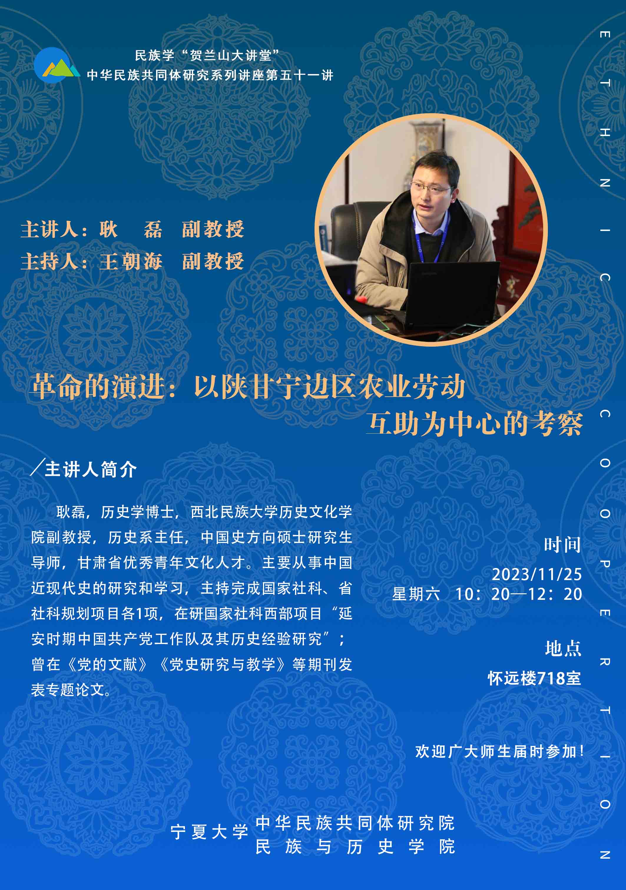 耿磊,历史学博士,西北民族大学历史文化学院副教授,历史系主任,中国史方向硕士研究生导师,甘肃省优秀青年文化人才。主要从事中国近现代史的研究和学习,主持完成国家社科、省社科规划项目各1项,在研国家社科西部项目“延安时期中国共产党工作队及其历史经验研究”;曾在《党的文献》《党史研究与教学》等期刊发表专题论文。