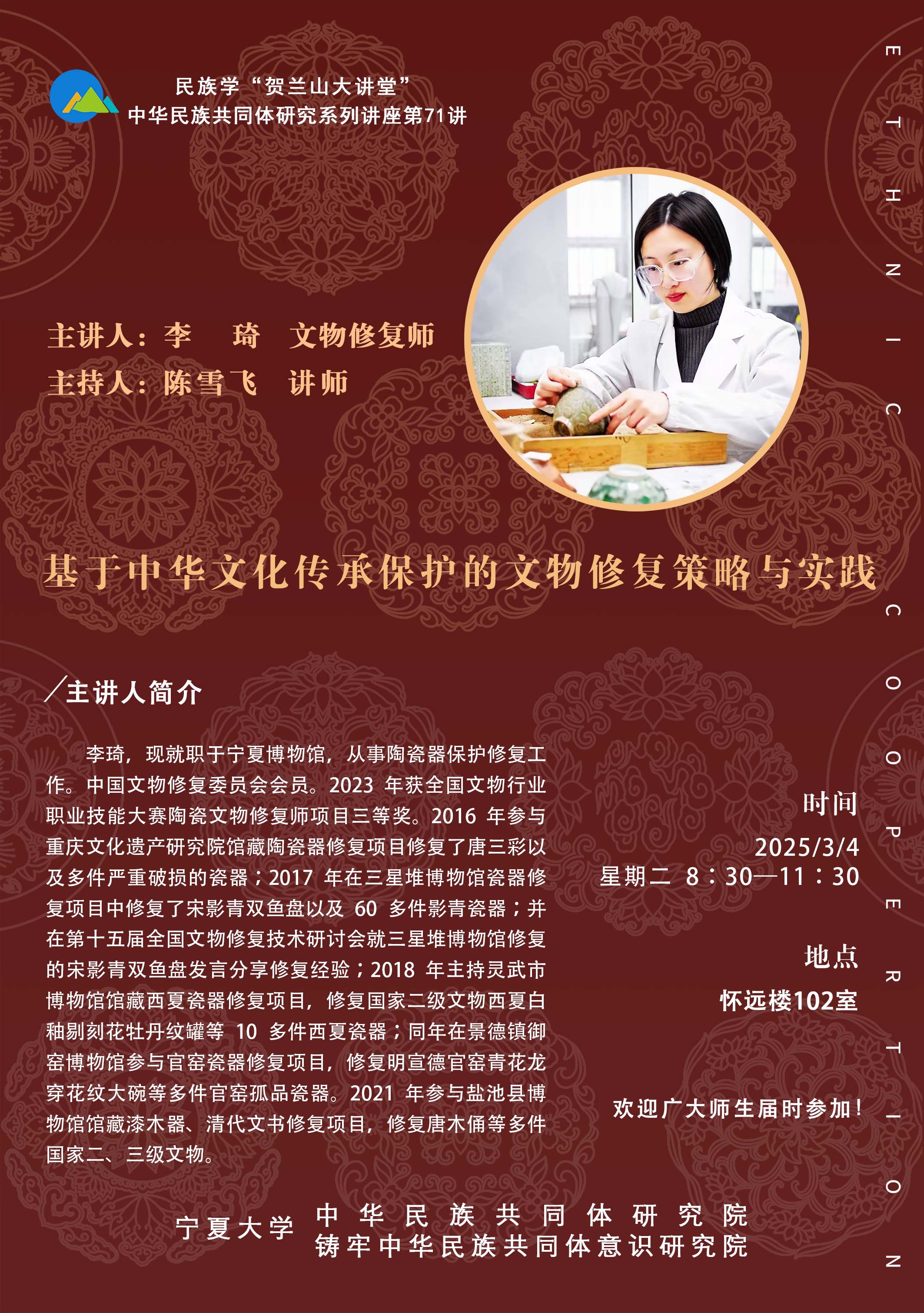 文物修复是中华文明赓续的重要实践,承载着守护文化根脉、激活历史记忆的使命。在全球化和现代化的双重背景下,如何通过科学修复实现文化遗产的“活态传承”,既是技术命题,更是文化战略的核心议题。本次讲座聚焦中华文化基因的解码与再现,系统阐释文物修复中“保护—传承—创新”的协同路径,结合典型案例,探讨如何以修复实践推动文化认同,助力中华优秀传统文化的创造性转化与创新性发展。